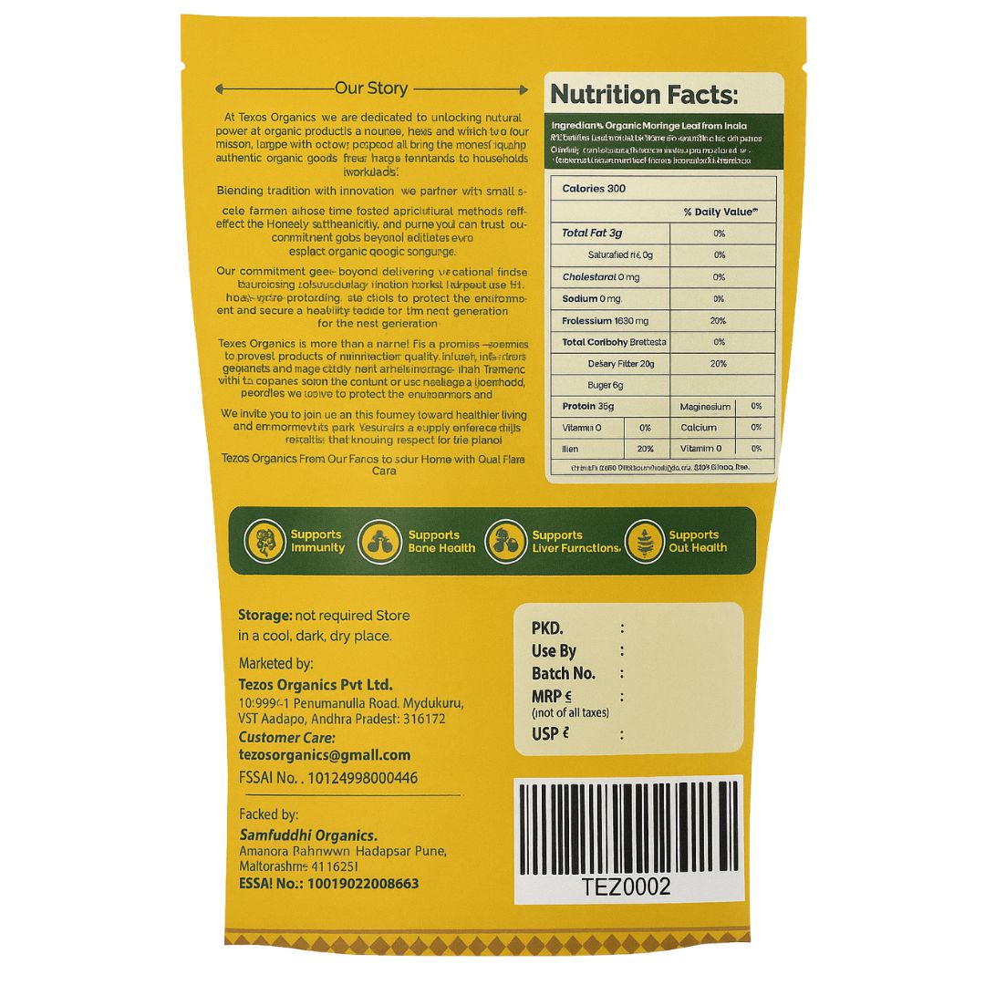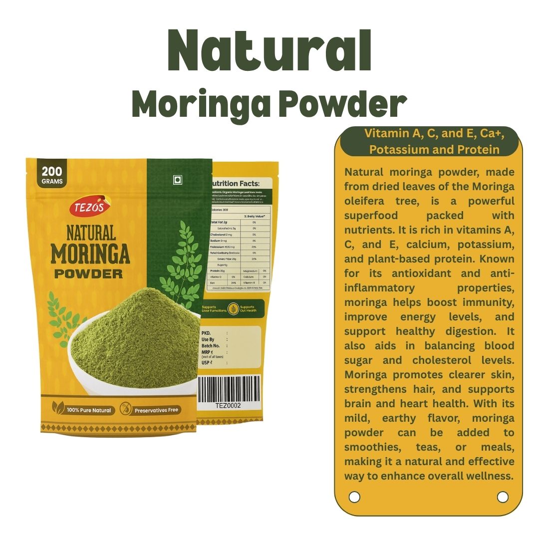 Tezos Moringa Powder is made from shade-dried moringa leaves, rich in nutrients, antioxidants, and protein. Known as the “Miracle Tree,” Moringa supports immunity, energy levels, and metabolism. It is ideal for smoothies, curries, or as a daily wellness booster.